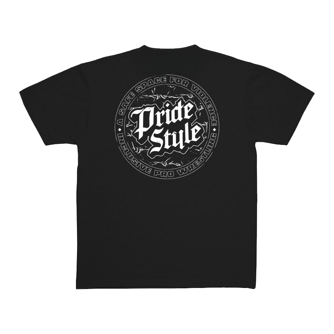 Back: Large stack PrideStyle logo with barbed wire backdropped, surrounded by “A Safe Space For Violence” and “Inclusive Pro Wrestling”.