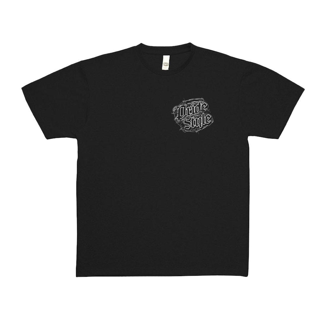 Front: Small stacked PrideStyle logo surrounded by barbed wire.